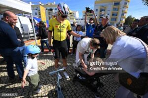 HARELBEKE, BELGIUM - MARCH 28: Wout Van Aert of Belgium and Team Visma | Lease a Bike meets his son Georges Van Aert and wife Sarah De Bie prior to the 68th E3 Saxo Bank Classic - Harelbeke 2025 a 208.8km one day race from Harelbeke to Harelbeke / #UCIWT / on March 28, 2025 in Harelbeke, Belgium. (Photo by Tim de Waele/Getty Images)