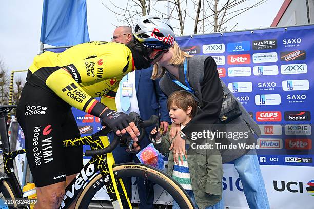 HARELBEKE, BELGIUM - MARCH 28: Wout Van Aert of Belgium and Team Visma | Lease a Bike meets his son Georges Van Aert and wife Sarah De Bie prior to the 68th E3 Saxo Bank Classic - Harelbeke 2025 a 208.8km one day race from Harelbeke to Harelbeke / #UCIWT / on March 28, 2025 in Harelbeke, Belgium. (Photo by Tim de Waele/Getty Images)