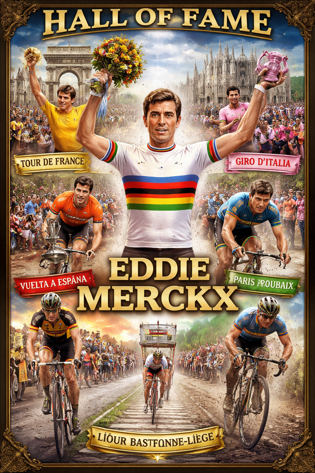 In de geschiedenis van het wielrennen dragen maar weinig namen zoveel gewicht en eerbied als Eddy Merckx. Bekend als “De Kannibaal” vanwege zijn onverzadigbare honger naar overwinningen, deed Merckx meer dan alleen meedoen—hij domineerde. Van de slopende beklimmingen van de Tour de France tot de meedogenloze kasseien van Parijs–Roubaix, hij veroverde elk terrein met ongeëvenaarde kracht, precisie en vastberadenheid. Zijn vermogen om te winnen in alle soorten koersen—Grote Rondes, klassiekers en tijdritten—onderscheidde hem in een sport waar veelzijdigheid zeldzaam is en echte grootsheid nog zeldzamer.