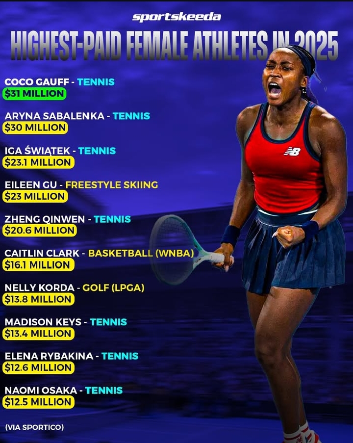 Coco Gauff leads all female athletes in 2025, earning around $31 million. Her income is fueled by major tournament results and a strong portfolio of sponsorship deals. With her global popularity and steady success, she’s firmly established as the top financial force in women’s sports.