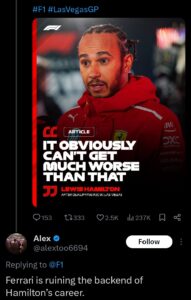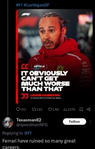 Las Vegasin yövalot lupasivat spektaakkelia, nopeutta ja loistoa – mutta Ferrarille ja Lewis Hamiltonille viikonloppu otti odottamattoman ja tuskallisen käänteen. Aika-ajon viimeisenä sijalla 20 Hamilton lähti varikolta näkyvästi turhautuneena ja myönsi: “Se ei tietenkään voi olla paljon pahempaa.” Kun reaktiot tulvivat sosiaaliseen mediaan, monet Ferrarin kannattajat muistuttivat tiimin todellisesta identiteetistä: sitkeydestä, yhtenäisyydestä ja syvästä historiasta tällaisten hetkien voittamisesta.