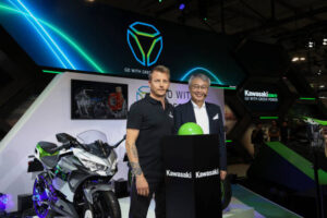 MILAN, ITALY – : Kimi Räikkönen and Hiroshi Ito attends at Yamaha stand during the EICMA (Esposizione Internazionale Ciclo Motociclo e Accessori) International Exhibition Cycle Motorcycle and Accessories show  in Milan, Italy. The show features world premieres, new concepts, and technical developments in the two-wheeler industry.