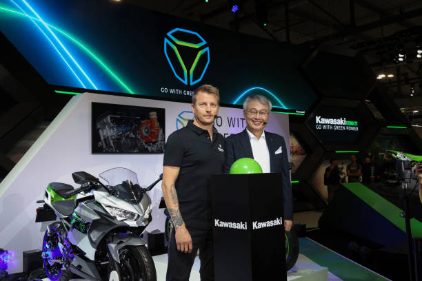 MILAN, ITALY - NOVEMBER 08: Kimi Räikkönen and Hiroshi Ito attends at Yamaha stand during the EICMA (Esposizione Internazionale Ciclo Motociclo e Accessori) International Exhibition Cycle Motorcycle and Accessories show on November 08, 2022 in Milan, Italy. The show features world premieres, new concepts, and technical developments in the two-wheeler industry. (Photo by Pietro D'Aprano/Getty Images)