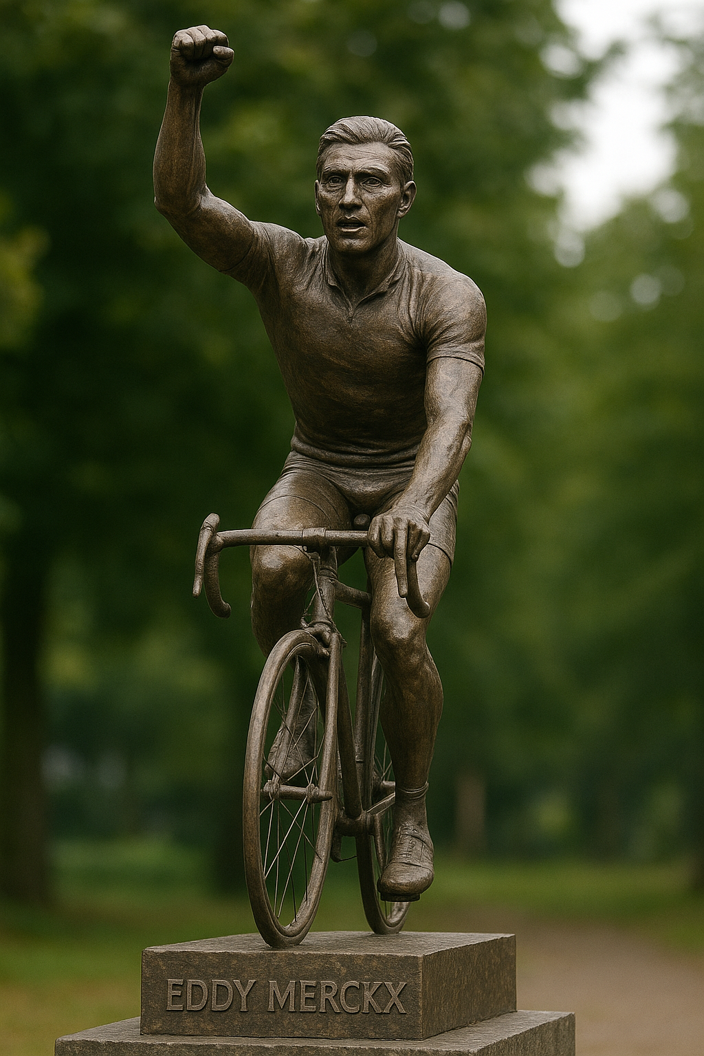The bronze monument, positioned in the heart of Woluwe-Saint-Pierre, where Merckx was born, captures him in full motion — gripping the handlebars, eyes locked on the finish line, the very image of determination that made him unstoppable during his prime. Every detail, from the creases in his jersey to the intensity in his expression, tells the story of a man who devoured competition with unmatched hunger.